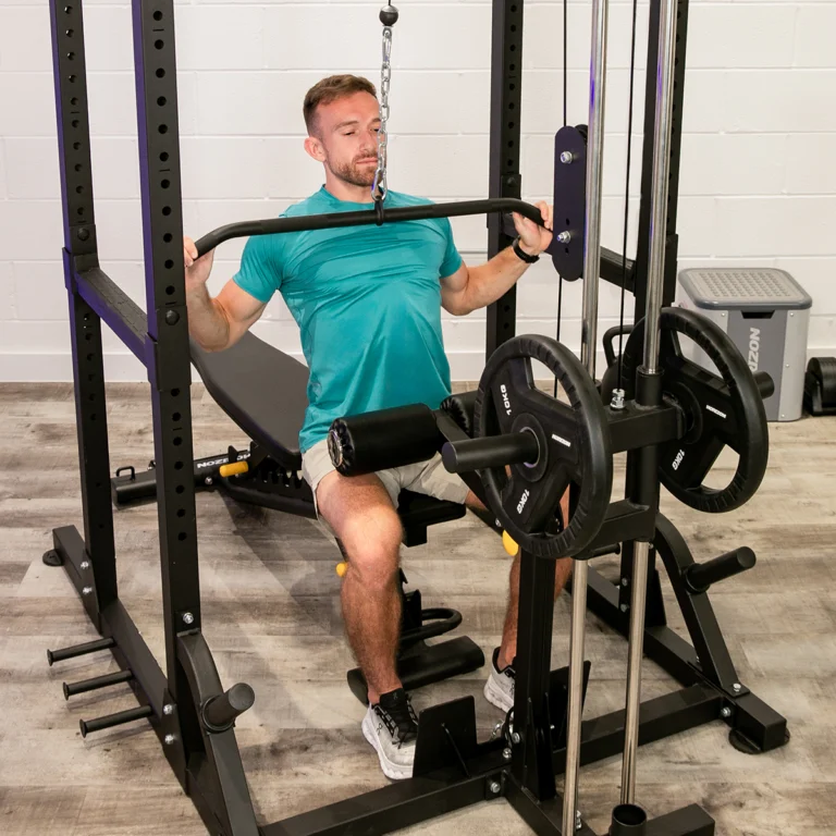 パワーラックがスクワットやベンチプレス、体重を使ったトレーニングをサポート。安全スポッターアーム搭載で、自宅でも安心して限界に挑戦できます。