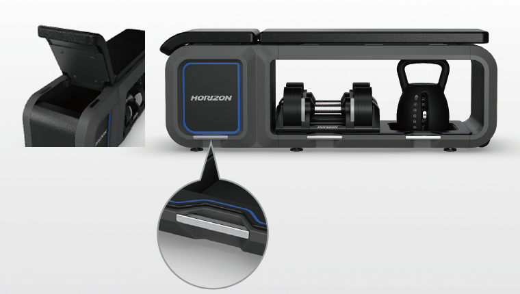 レジスタンスバンドをアンカー・ポイントに簡単に取り付けられ、多様な強度に挑戦可能。ベンチには収納スペースを備え、ダンベルやケトルベルなどのアクセサリーを手軽に取り出せます。